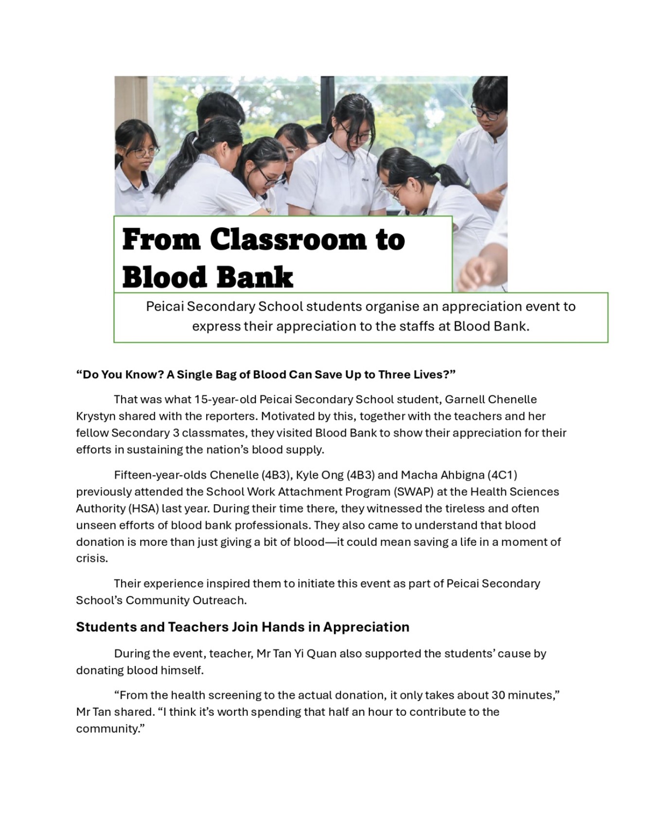 Peicai Featured on Zaobao Schools for Meaningful Visit to Blood Bank@HSA