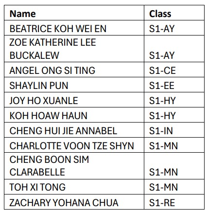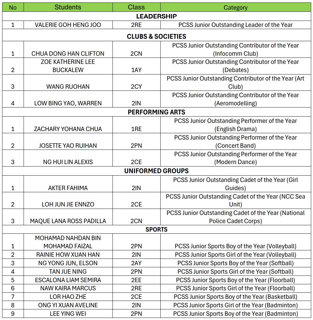 Recognises and affirms Sec 1-2s students who have outstanding contributions to their CCAs. |