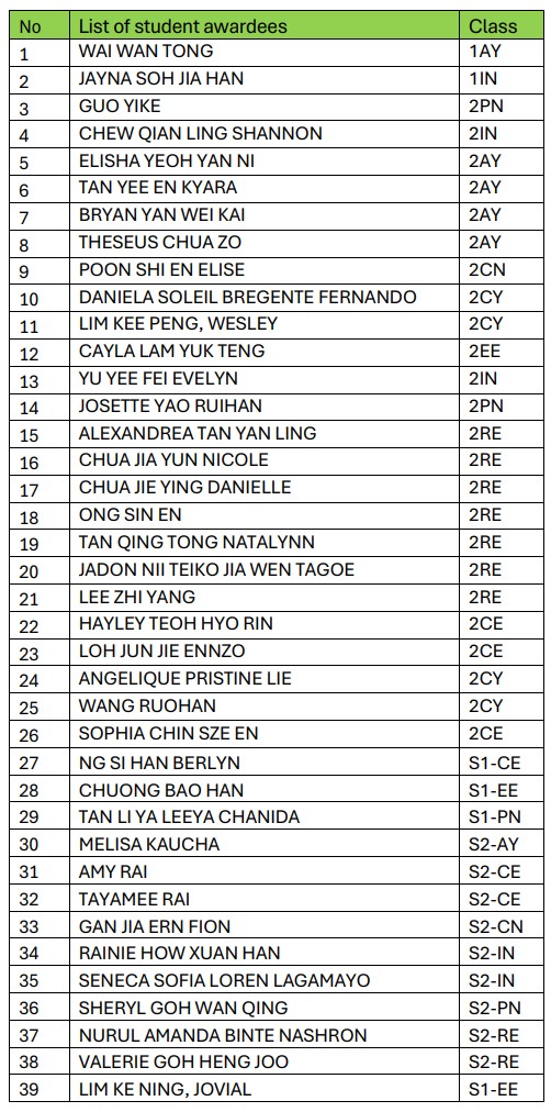 In addition to awards such as EDUSAVE, ECHA and EAGLES, the school has several school-based awards to recognise and affirm students for their passion, dedication and resilience.