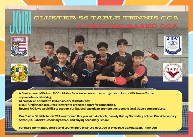 The S6 Center-Based CCA for Table Tennis is an MOE initiative where a few schools come together to form a CCA to provide a wider variety of choices, promote social mixing and pool funding and resources to promote more sports for competition and for play.