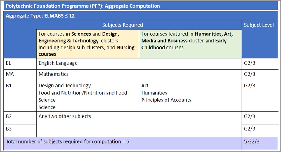 Entry requirements such as the ELMAB3 raw aggregate score of ≥ 12 points, and the subject requirements for English Language, Mathematics and ‘Relevant’ subjects, will be retained.