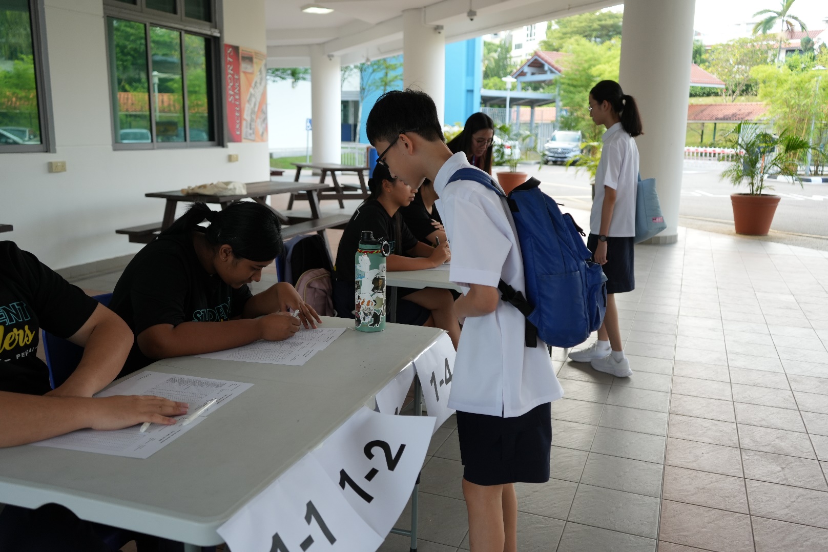 Sec 1 students registering their attendance at the registration booth |